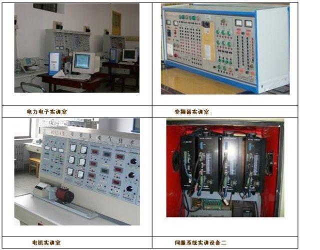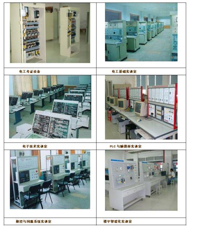 制图测绘实训室、电工实训室、电子实训室、电气控制实训室、三菱PLC实训室、校内西门子自动化实训中心、电工考证实训室、变频实训室、单片机实训室、制冷空调实训室、楼宇智能化实训室。