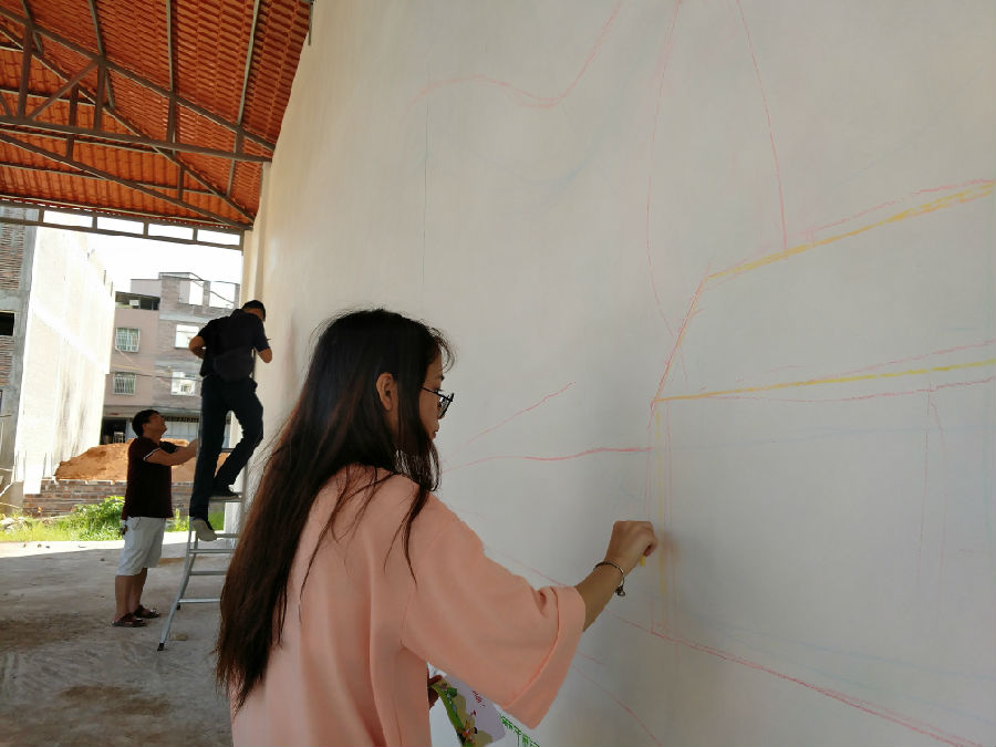 2018年7月17日,365娱乐网“河山大好,源因为你”暑期社会实践团队在指导老师罗雪榕老师和邓良志老师的带领下,历经5个多小时,达到河源龙川车田,进行为期一周的实践旅程;此次社会实践较之以往有了“创新”,因此365娱乐网的志愿者携艺术设计学院的志愿者,开展了一场以“不忘初心跟党走,撸起袖子加油干”为主题的墙绘之旅。7月18日正是墙绘的第一天,让他们来领略大家的风采吧。 开工第一天,墙绘小分队的志愿者们跟随着大部队进行物资采购,期间与当地村民发生了有意思的对话,让他们初步了解到“十九大”在当地的影响。 购买完物资之后,墙绘小分队的成员赶往广场中央的墙绘地点,开始了一天的工作。虽然此次墙绘的工程量较大,但是志愿者们都顶着烈日,挥汗如雨,在室外极高温的情况下认真积极的开展工作,加班加点地完成手头上的任务,期间他院的几位辅导老师还亲自上阵,定稿上色,与同学们一起合作,挥晒汗水,将原本初定一天半的确定比例、完成初稿的任务于一天完成,并已经开始进行上色处理,首战告捷。 仅仅一天的墙绘活动,就让大家收获满满,明白了沟通的重要性,也学会了如何去更好的沟通,这在日常生活中是尤为重要的,在他们走出校园、走进社会也是受益匪浅的,更何况大学就是一个小社会;同时,也让他们对“十九大精神”有了更加深刻的理解。 ——365娱乐网